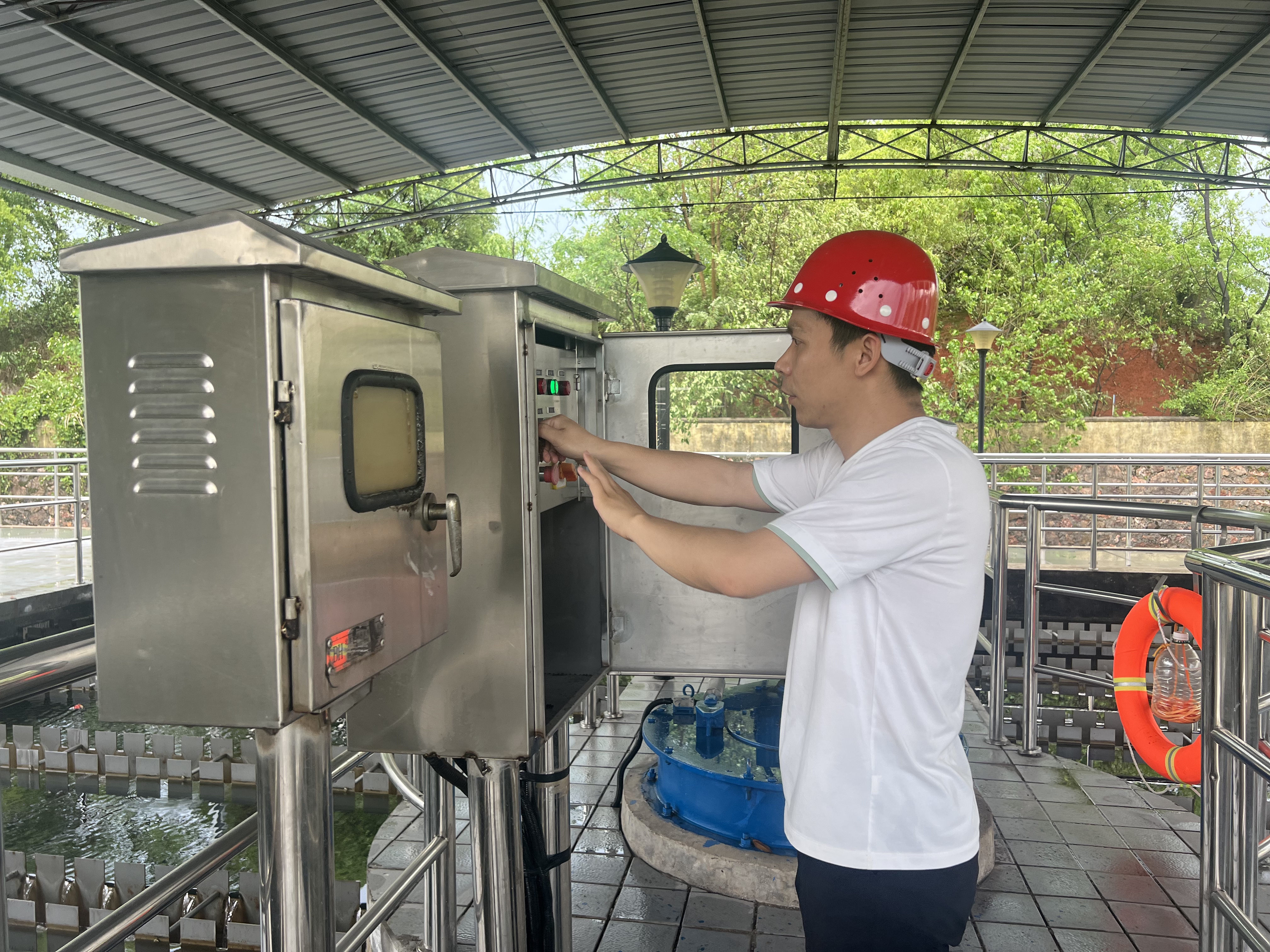 在氧化沟旁,生产部部长晏铁俯身检查曝气盘运行状态。“暴雨可能导致瞬时水量激增,必须确保曝气均匀性。”与此同时,二沉池边的胡勇正用竹竿探测池底积泥情况,“刮泥机轨道无偏移,泥位在安全阈值内”。电工黄清带着红外测温仪,逐一检测高压配电柜接头温度;机修班长罗文辉蹲在高效沉淀池加药泵旁,用听音棒辨别设备异响。