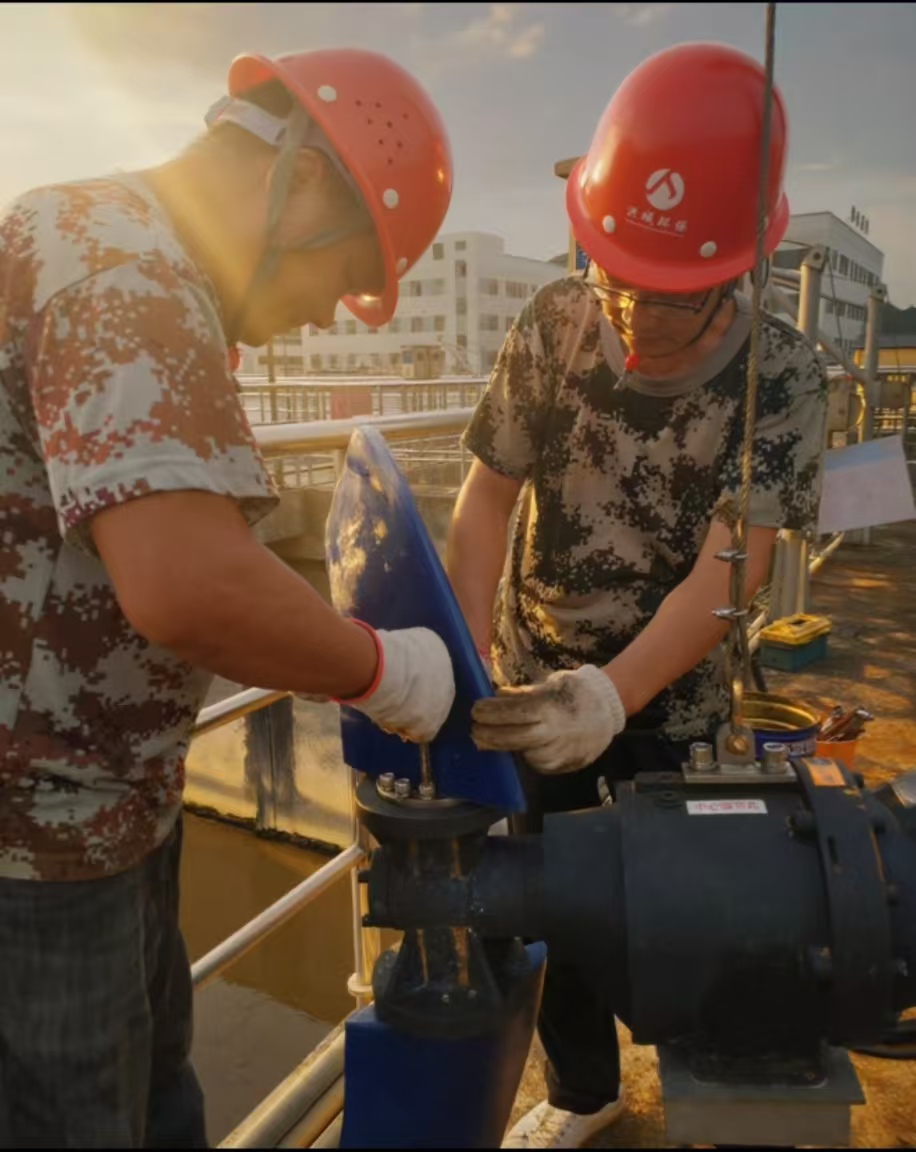 氧化沟旁,推流器的异响打破了闷热的沉寂。机修班组闻讯而动,三步并作两步冲向故障点。“叶片脱落”机修人员的判断斩钉截铁。烈日下,吊装设备的金属部件已烫得无法徒手触碰,他们裹着浸透盐渍的工装手套,拧螺丝、拆叶片、换轴承,蒸笼般的环境里,汗水顺着安全帽带汇成溪流,工服在湿透与烘干间反复轮回。两个小时的争分夺秒,两个小时的挥汗如雨,设备轰鸣声重启的瞬间,一张张通红的脸庞在油污与汗水中绽开笑容——“值了!”