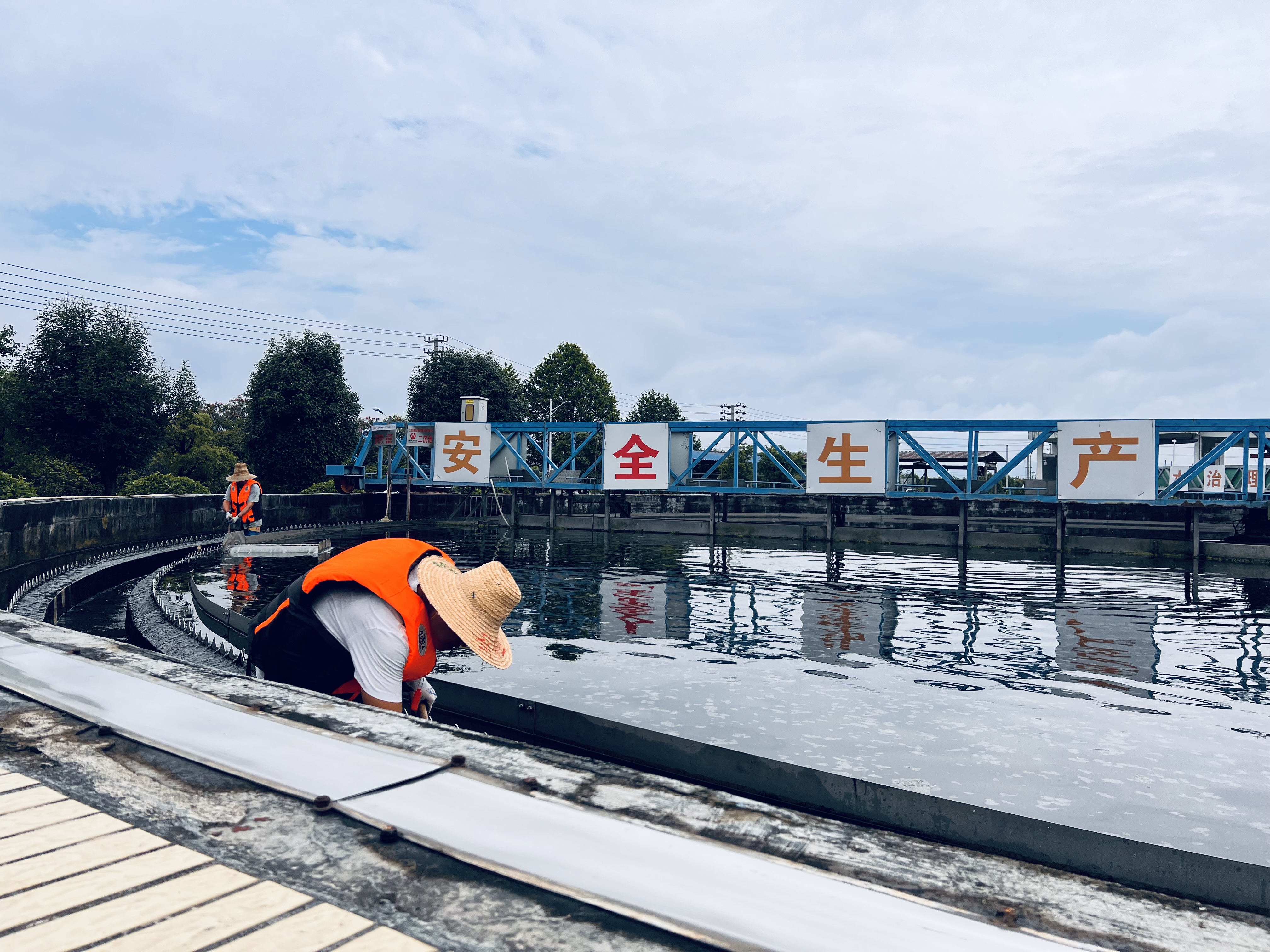 余琴琴在交接完班后,头顶烈日、全副武装进入“作战”现场。在对各池体打扫清涝后,她开始仔细对提升泵、细格栅、氧化沟、高效沉淀池、次氯酸钠消毒池等进行巡查,确定各部位全部正常后,她才在运行记录上逐一打钩,汗水滴落在记录本上,全然不知。来不及停歇,她又迅速来到二沉池刮吸泥机上仔细查看、聆听,并依次对虹吸管进行预防性疏通,一根2米多长、1公斤重的软管在她的手上挥动自如,脸上豆大的汗珠也跟着节奏飞舞起来。2台刮吸泥机的虹吸管她都根据手感、回声分析有无被垃圾堵塞,看着她专注的神情,让人感觉到她是在用“心”保证设备的通畅。