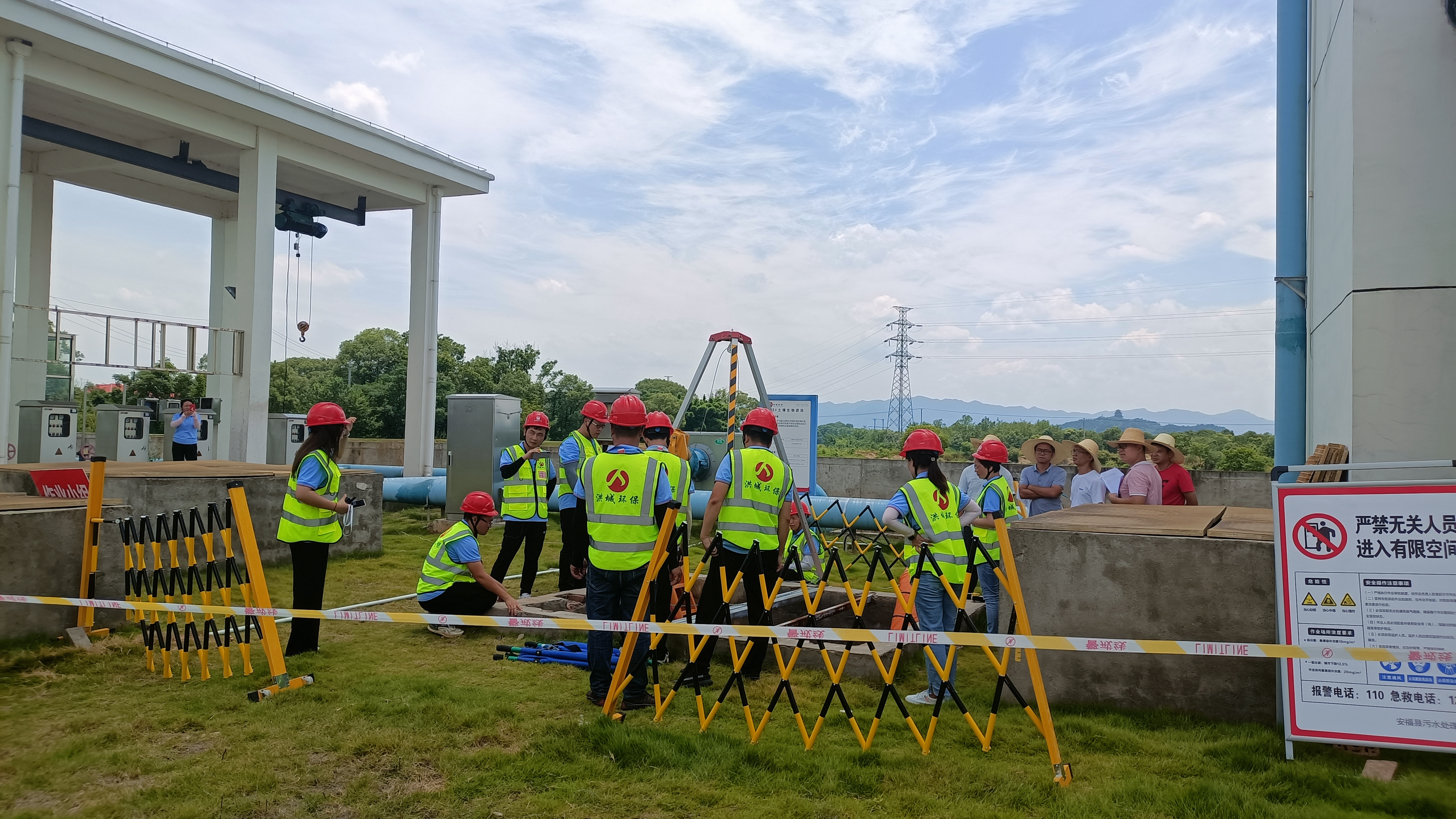 此次演练竞赛评比项目为有限空间作业应急救援演练和突发水质异常应急演练,各污水处理厂负责人现场随机抽取一个项目作为比赛内容。其中泰和污水处理厂抽到有限空间作业和应急救援演练,演练过程流畅,动作熟练、准确,分工明确。