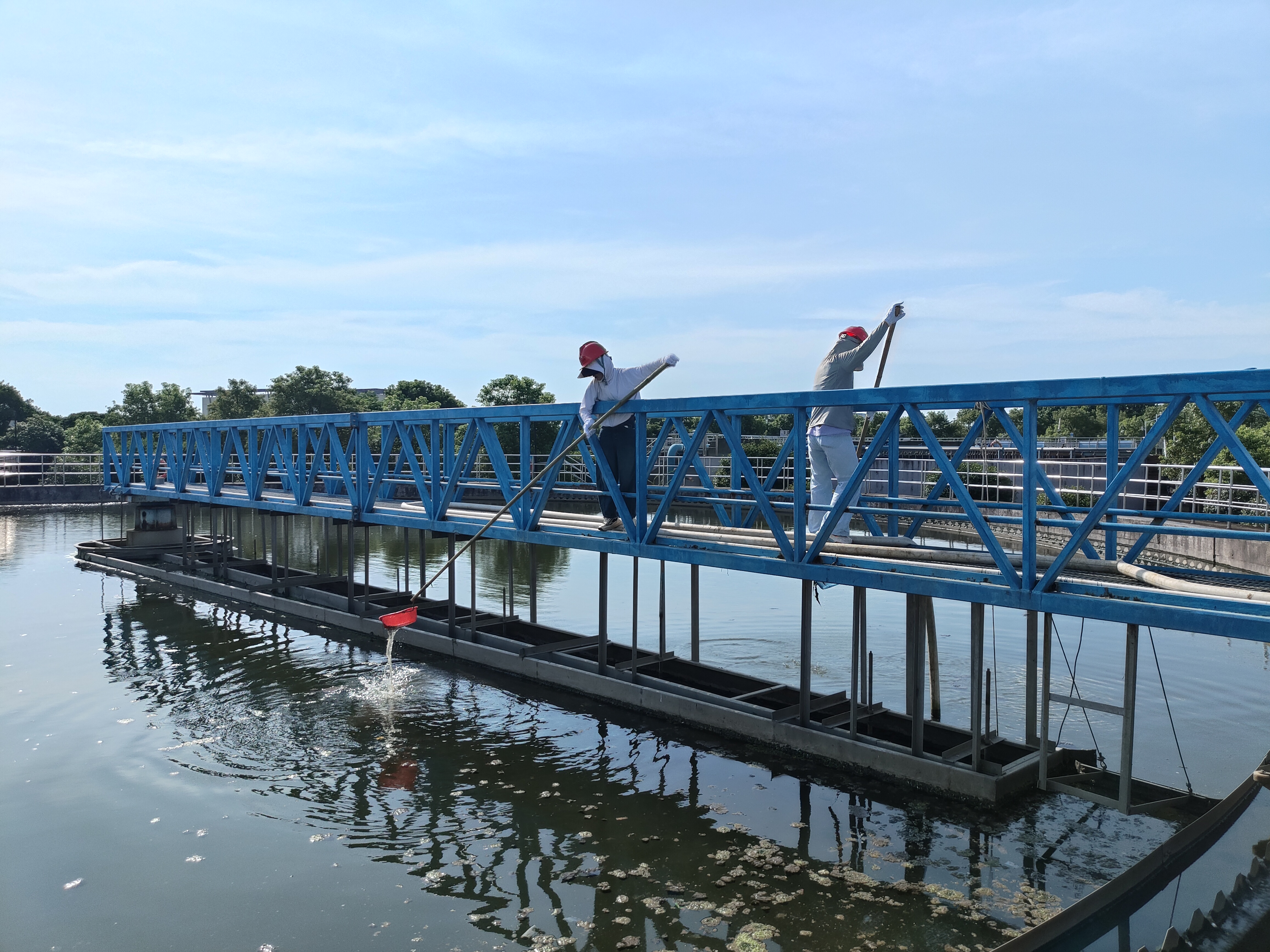 运行班主要负责厂区设备及仪表的巡检工作,每天一上班就要开始巡检,每两小时巡检一次,一圈下来大概需要40分钟左右,夏日的室外没有遮挡,阳光直射体感温度高,让巡检工作变得十分辛苦。为使二沉池在处理过程中达到稳定运行,保障水质达标排放,运行班员工叶璇、舒燕群忍耐高温,奋力的在打捞着二沉池的浮泥及垃圾。