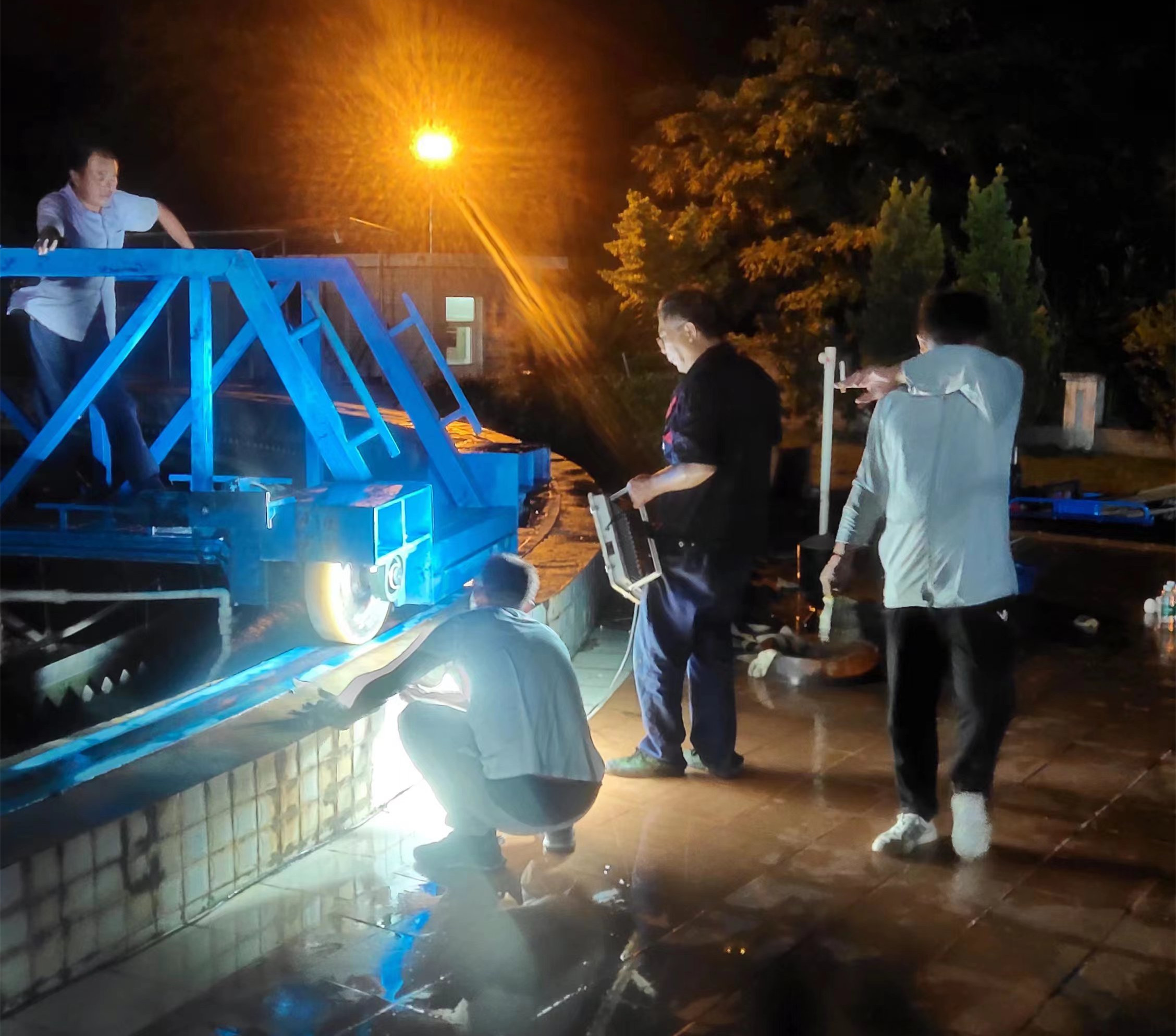 抢修工作中,一个看似简单的零件,组装起来却是成倍的困难,尤其是吸刮泥机这类大而重的设备,每进行一个步骤都要小心翼翼,防止滑落、防止砸伤,时刻谨记安全第一的原则。在固定、拧紧、垫高、锤敲中不知不觉夜色渐渐袭来,蓝天白云逐渐转为火红的晚霞,再渐渐的黑夜笼罩下来。厂区的灯自动亮起,抢修人员忘记了时间,忘记了疲惫,他们在灯光下继续忙碌着,衣服湿了又干干了又湿,夜晚的微微凉意给他们带来些许安慰。他们一鼓作气不屈不挠,在大家的团结协作下将行走轮顺利安装回位,当开机开心按下的那一刻,他们的内心无比忐忑,成功与否,不得而知。