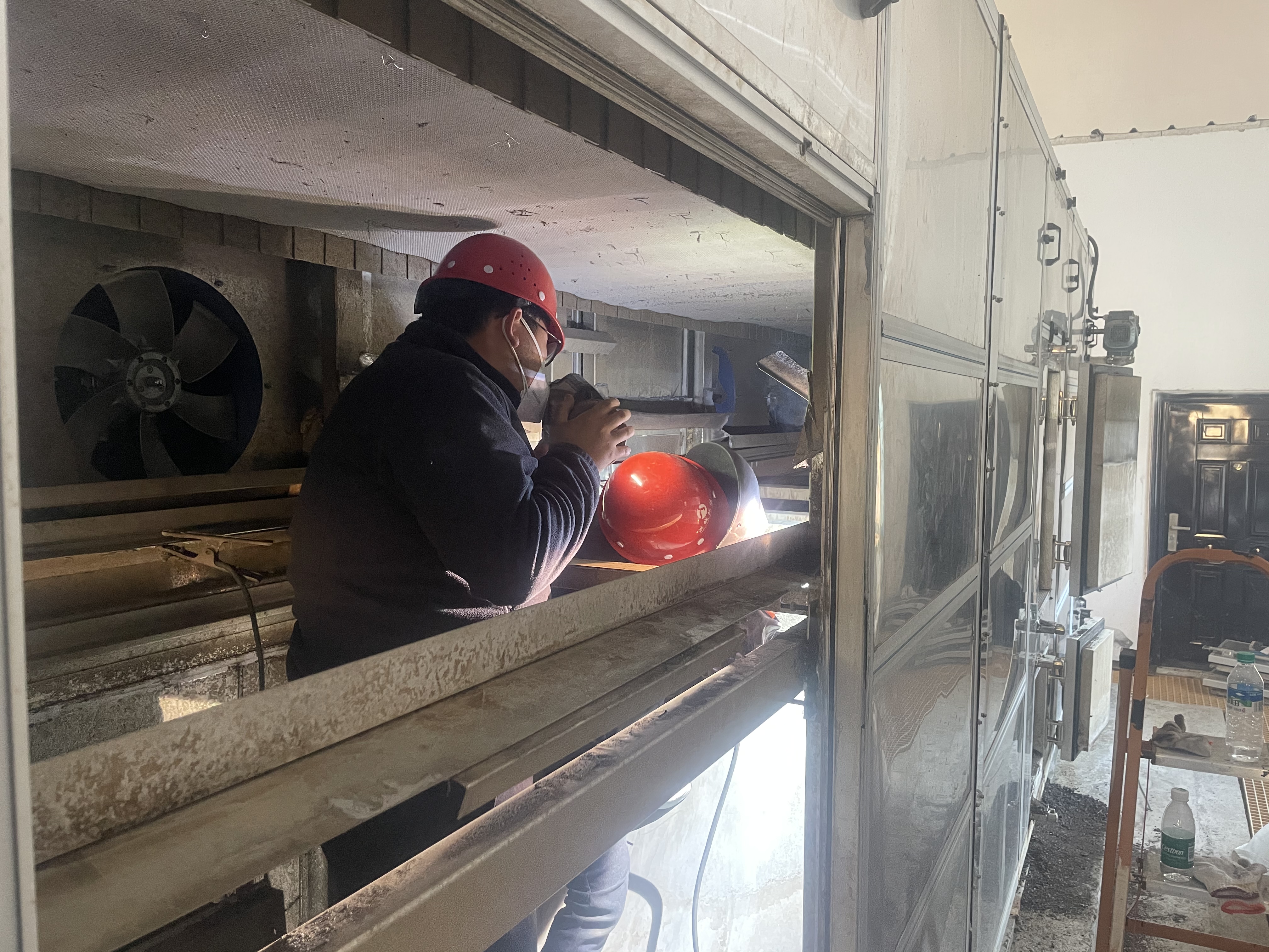 接到通知,机修班立即来到现场有条不紊地开展检修工作。经过排查,发现干化机内部导轨变形,导致网链脱落,考虑到网链在干化机内部,且作业现场狭小,需要进入内部,将导轨及网链拆下进行修复。时间紧、任务重,机修班对干化机内部进行通风处理后,班长王一夫穿戴好防护装备,一头钻进满是污泥的机器内部,他们配合无间,从白天到黑夜,一滴滴辛勤劳动的汗水流淌在泥里,一曲曲赞歌跃然于纸上。他们满身污泥、满脸疲惫,他们以不叫苦、不怕脏、不嫌臭的精神,完成了一次次的抢修任务。