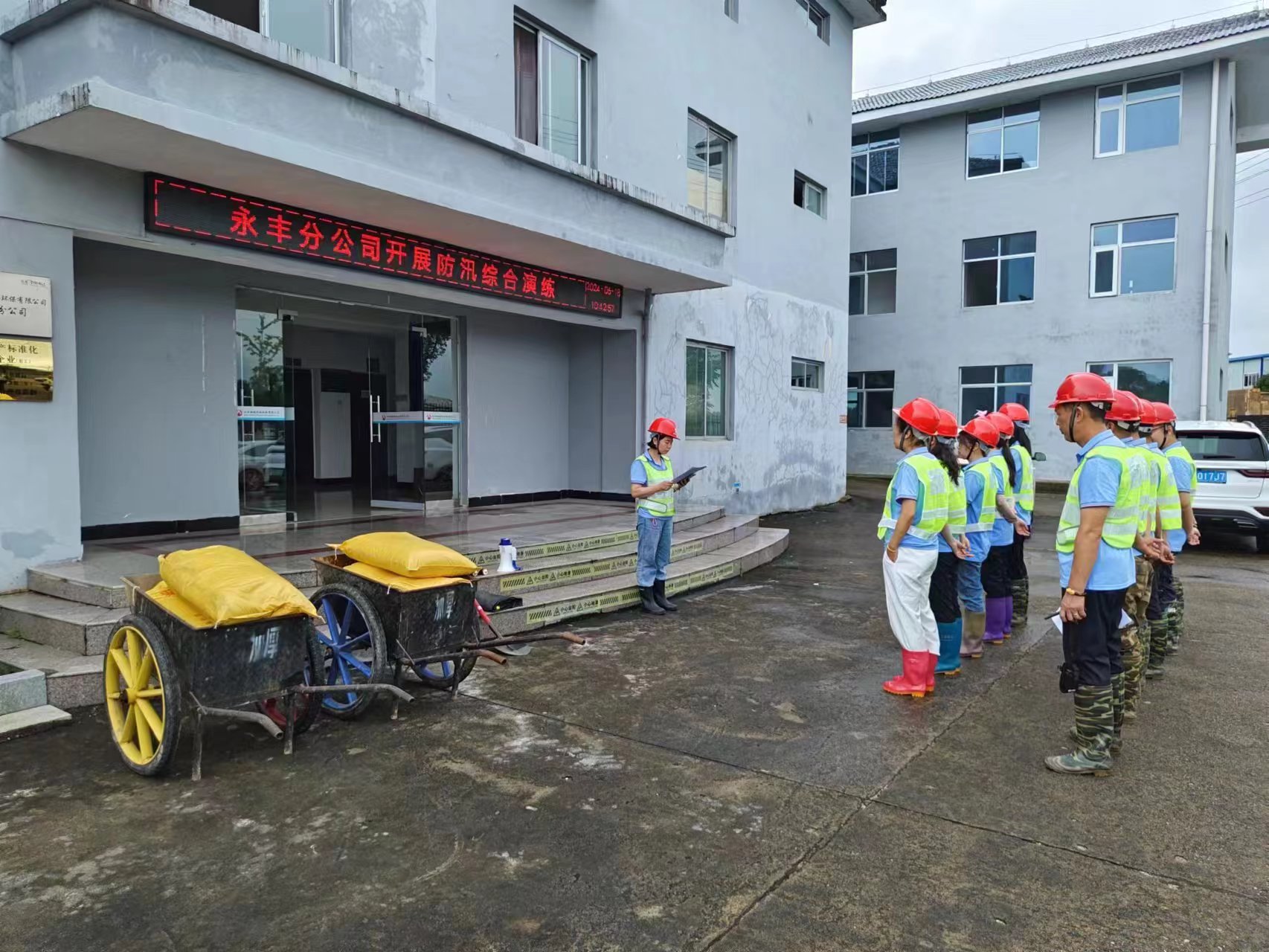 本次演练模拟了连绵暴雨带来的洪水,致使我厂周边河水水位上涨,将要淹至厂区。迫在眉睫的危机对人员通行安全和厂内生产构成了极大的挑战。在接到“险情”通报后,永丰污水处理厂迅速启动防汛预案,外围警戒组、抢险救援组和通讯疏散组立即展开行动。外围警戒组第一时间设立警戒带,切断厂区电源。抢险救援组兵分两路行动,一路迅速使用沙袋封堵配电房门和进水站房门,防止雨水灌入,使各电器设备不受损害;另一路则火速前往化验室,抢救重要文件和仪器仪表。就在此时,各小组接到通知,由于雨势过大,出现了人员被困的情况。通讯疏散组接到指令后,立即前往各办公室疏散人员,将他们撤离到安全地点,并妥善安置。