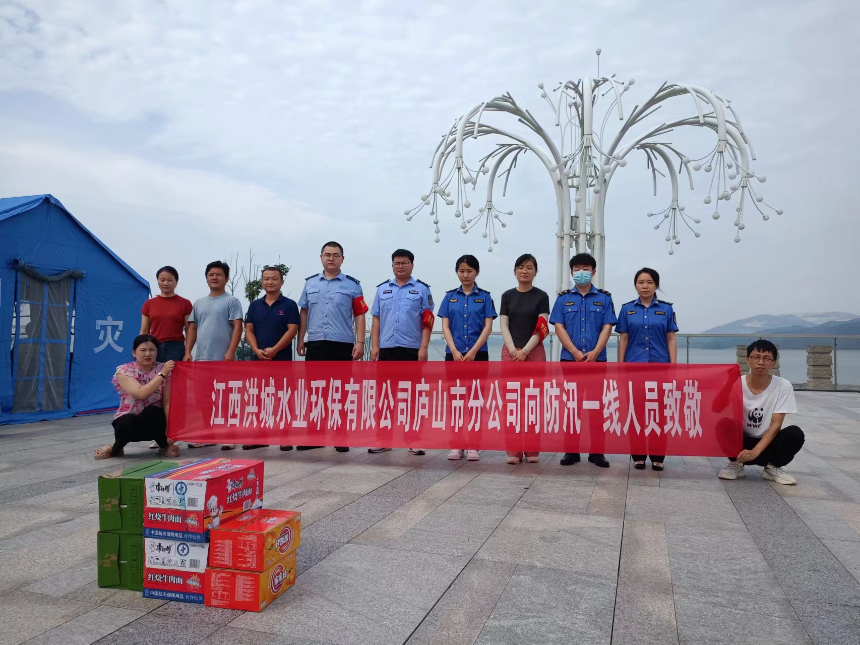 “各位一线防汛工作人员,你们辛苦了!”为表达对一线防汛人员的深深敬意和感激,我们带去了饮料、矿泉水、方便面等慰问品,为在酷暑中坚守的一线人员送去丝丝清凉,庐山市污水处理厂积极响应政府的号召,贡献我们一点绵薄之力,相信大家团结一心、齐心协力一定能共同打赢这场抗洪战役。在紫阳堤,我们看到的不只是汹涌的洪水,更是无数防汛工作人员坚韧不拔、勇往直前的精神风貌。