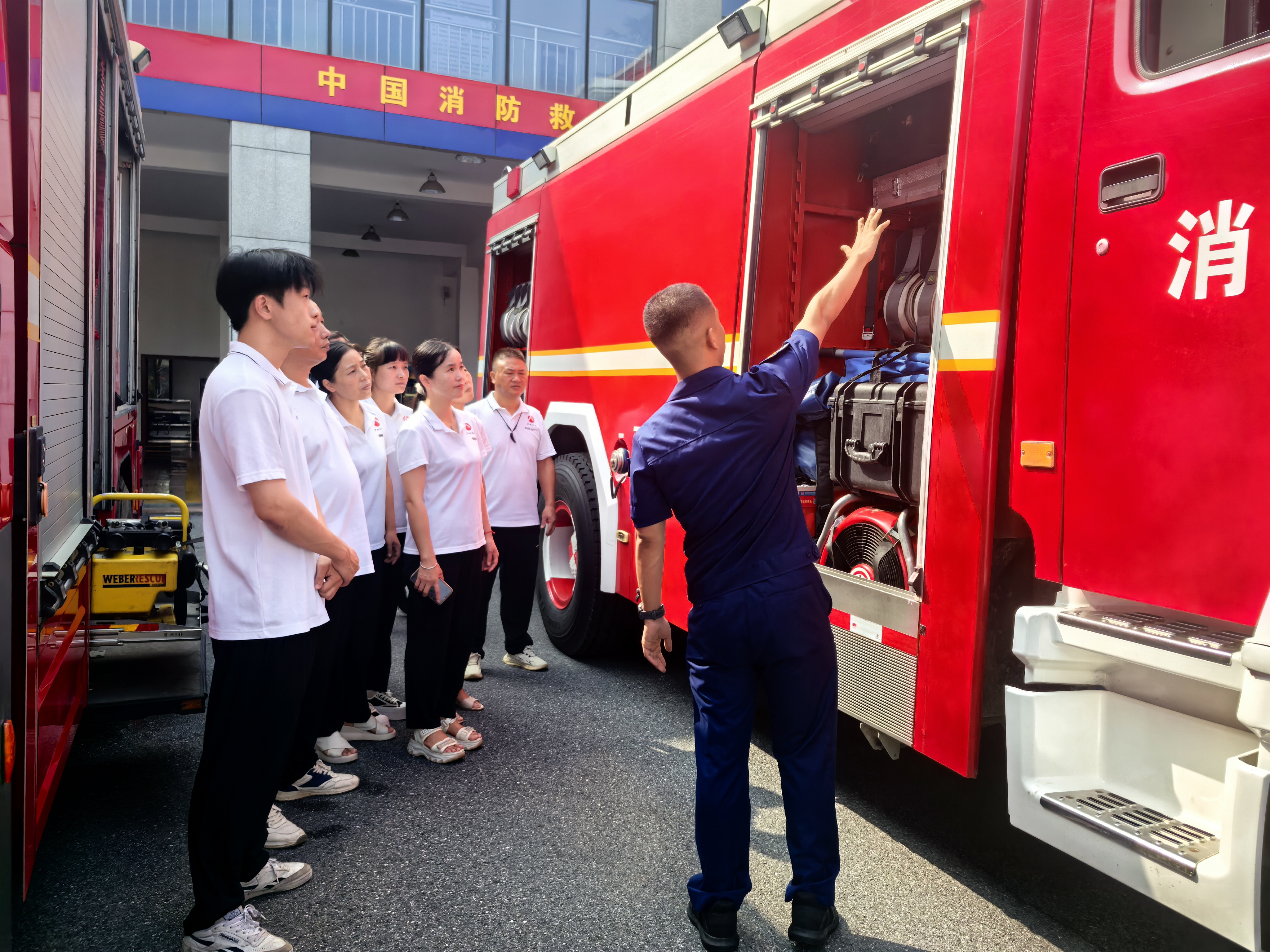 参观学习中,在消防员的引导下,大家依次参观了消防车库、装备库等营区环境,其消防员就消防车辆、器材装备的功能、用途和使用方法进行一一讲解,同时还对部分器材进行了现场演示,大家穿起消防员的战斗服,拿起消防器材亲身体验,面对这些厚重的大件小件装备纷纷感慨:“这装备这么重,刚披上身就已经很闷热了,多在身上待一分钟,都感觉要中暑了,更别说要去救援现场执行几个、十几个甚至几十个小时的任务,想着消防员在如此艰难的条件下,都能坚持到任务完成的最后一刻,再回想自己在工作上遇到困难就打退堂鼓、在工作上还有拈轻怕重,瞬间,对自己的自私行为,感到羞愧难当”。