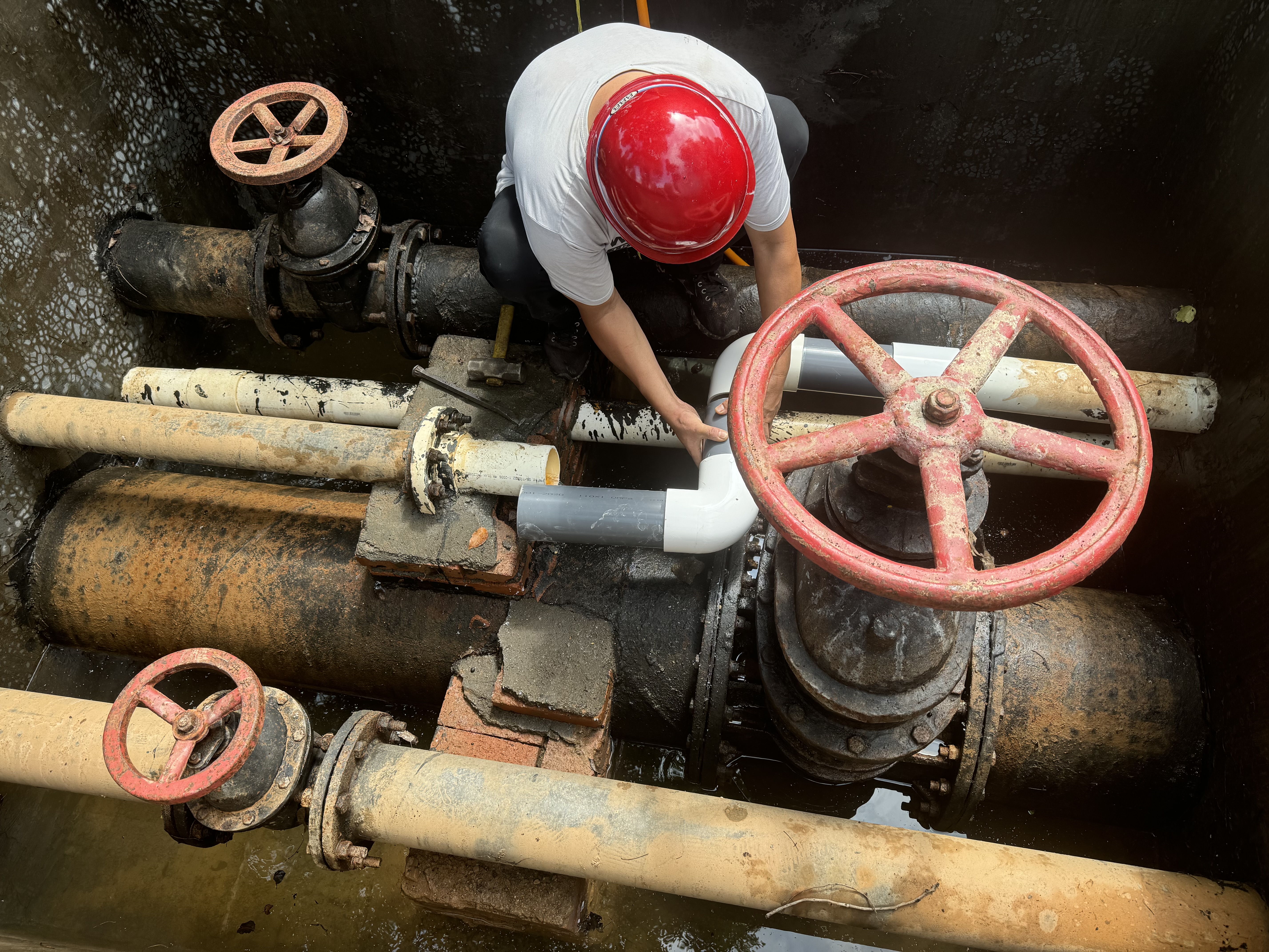 机修赶到现场对设备进行“望闻问切”后,初步判断水压过大,导致水管破裂。时间来到10点,中水池的水基本上已经排空,张昌汉和谢根生两人进入池底,不出所料水管因压力过大导致断裂,抢修工作就此紧锣密鼓地展开了。他们顾不上池子四边的脏污和异味,着手测量破裂水管的长度,准备将断裂的水管切割后替换,另一边得到数据就开始对新水管进行切割,三人分工明确开足马力同时开干,一时之间池底上下热火朝天、伴随着切割机发出来尖锐刺耳的声音就如同这炎炎夏日一样热情似火,只见半个多小时机修就把完成故障解决了。