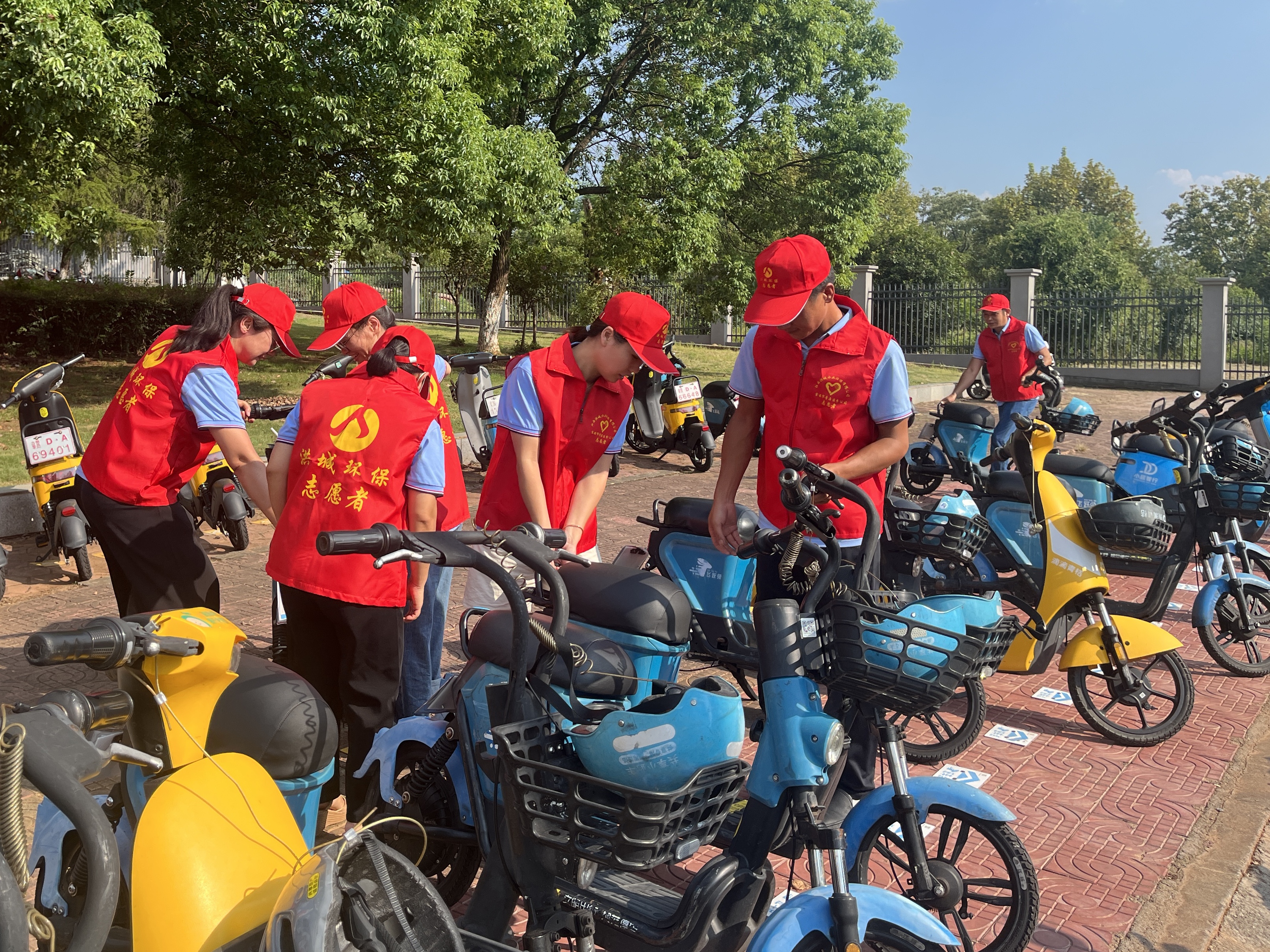 近期,由于天气炎热,共享电动车使用完乱摆乱放现象也多了起来,志愿者们在学校门口、火车站、广场路口、不间断地巡查,发现不少电动单车随意停放、占用在盲人车道、车头与车尾方向不一致、有的停放在绿化带,或是人行道里侧非停车区域的现象。“红马甲”志愿者们立即将东倒西歪的共享电动车扶正,摆放整齐,并用自带的抹布将它们擦拭干净,车筐内的垃圾也被清理干净。将损坏的车辆收集在一个区域联系企业运维人员进行清运处理,并温馨提示乱停乱放人员自觉将电动车摆放在专属停车区,为共享电动车停放区域提供一个安全、整洁、有序的骑行环境。